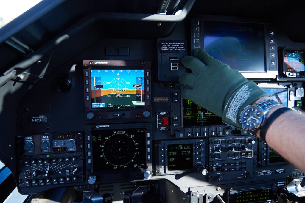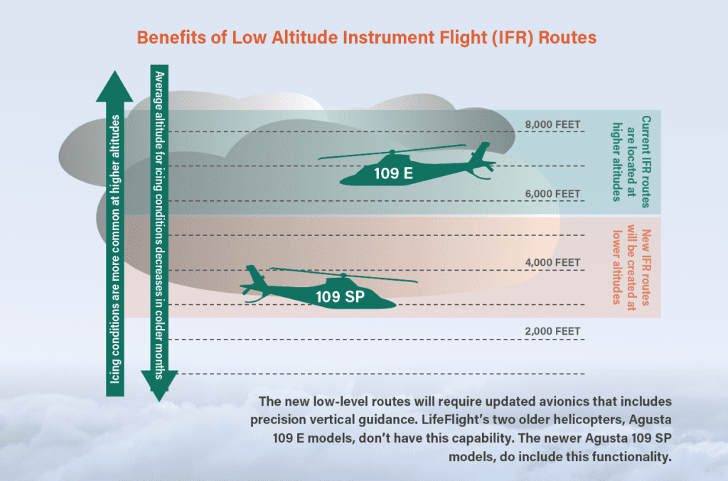 Today’s airspace is primarily made up of defined routes that go from one ground-based navigation station to another, and whose coordinates are accessible by aircraft pilots and air traffic controllers (ATC). Think of these routes as tunnels through the sky, defined by radio signals or GPS coordinates along the way. Because monitoring of the routes by ATC is based on data provided by ground-based radar, these tunnels are quite wide and often at a high altitude where bad weather and freezing conditions are more common. Now, when a call for help comes in to LifeFlight, our helicopter pilots check the weather along the route to determine if the mission can be accomplished safely. For most missions, the helicopters must use these predefined instrument flight (IFR) routes to get from point A to point B, which means even though the weather at 3,000 feet is acceptable, we can’t accept the mission because we have to fly a route that takes us to 7,000 feet where the temperature and humidity are producing icing conditions.