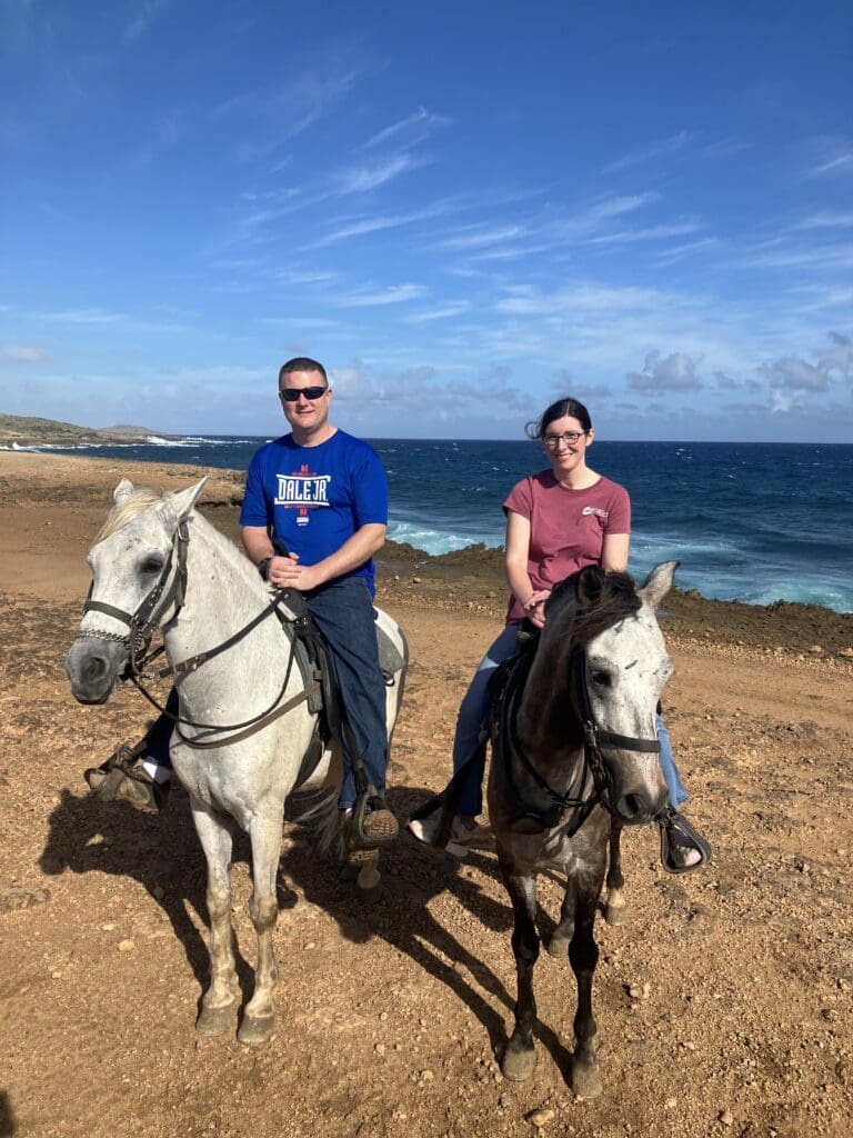Hollye and her husband, Matt, riding horses in Aruba six months after her LifeFlight transport.