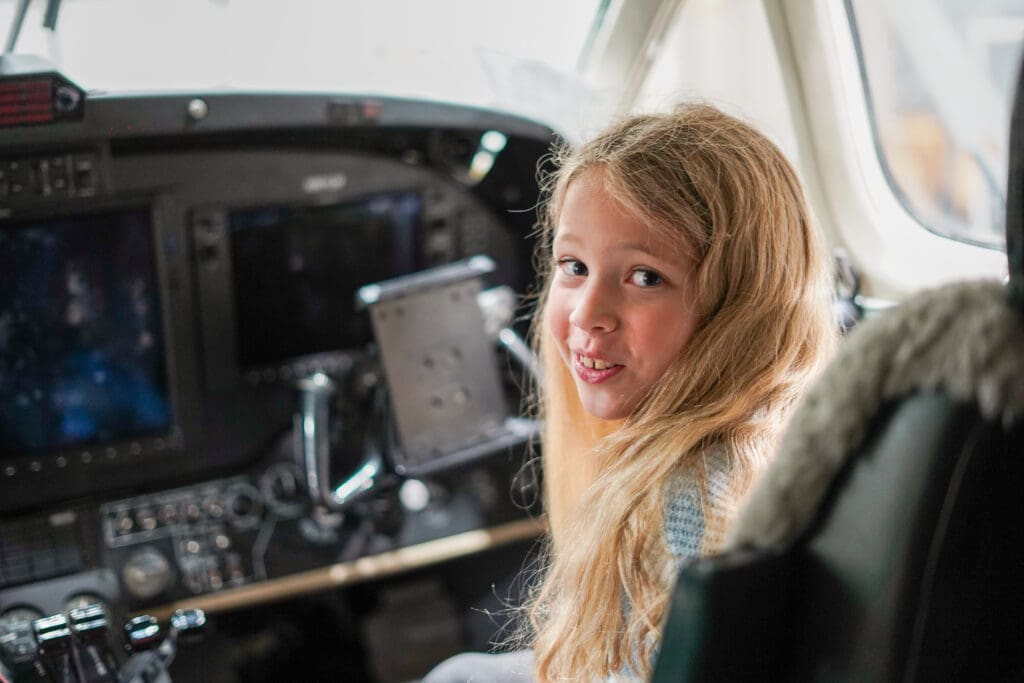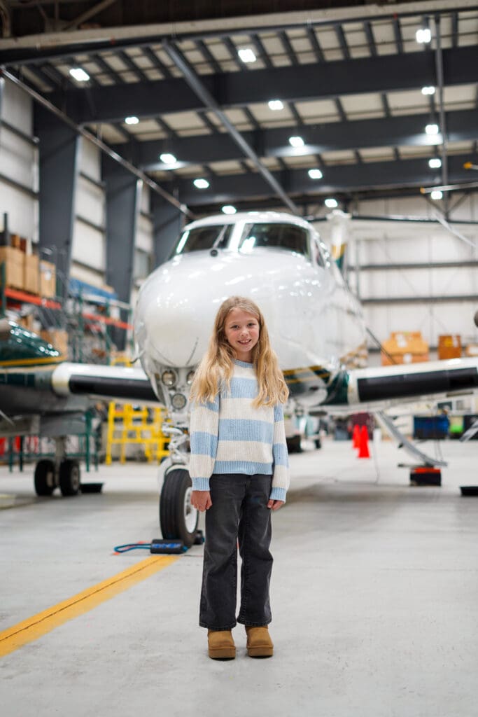 Lindsay and her parents visited the LifeFlight hangar in Bangor to see the clinicians who cared for her. Left: Kallaway in front of LifeFlight’s plane, Lima Mike. Middle: Kallaway, her parents, and Flight Paramedic Brent Melvin. Right: Kallaway in Lima Mike’s cockpit.